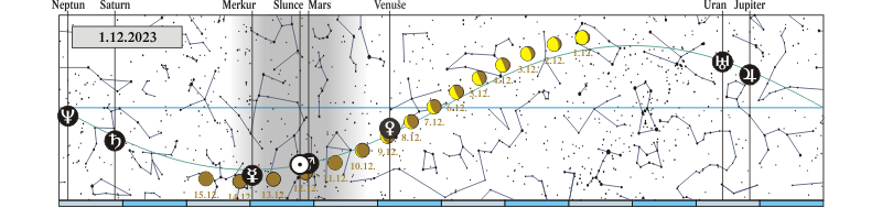 Měsíc v konjunkci s Jupiterem (Jupiter 1,45° jižně; seskupení Měsíce, Jupiteru, Aldebaranu a Plejád 22. až 24. 12. v první polovině noci) |