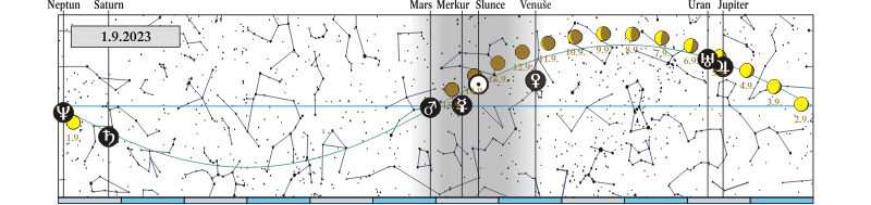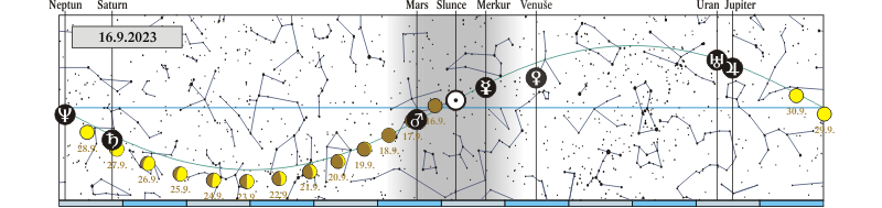 Měsíc v konjunkci s Jupiterem (Jupiter 2,15° jižně; seskupení Měsíce, Jupiteru, Aldebaranu a Plejád 4. až 6. 9. po většinu noci kromě večera) |