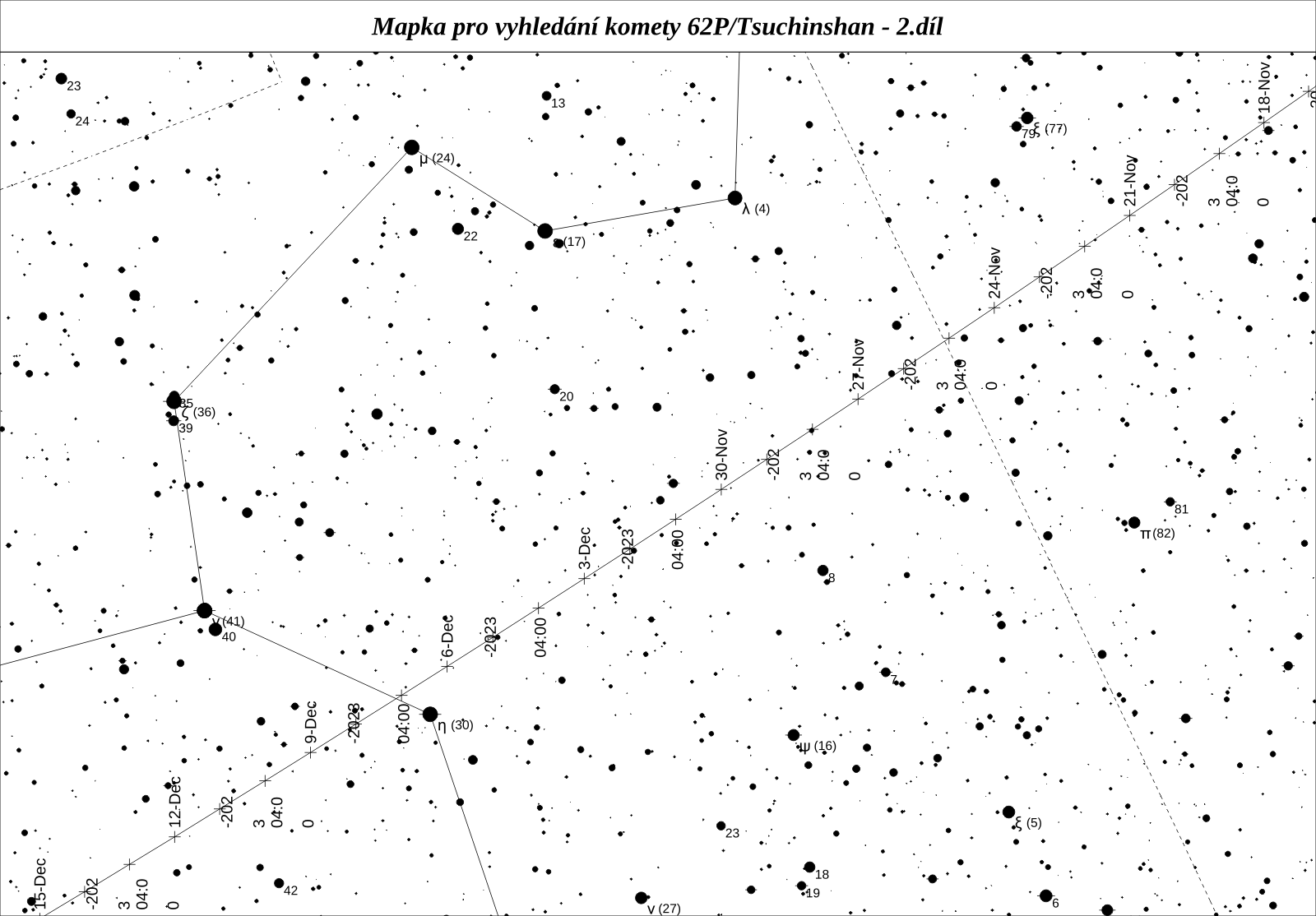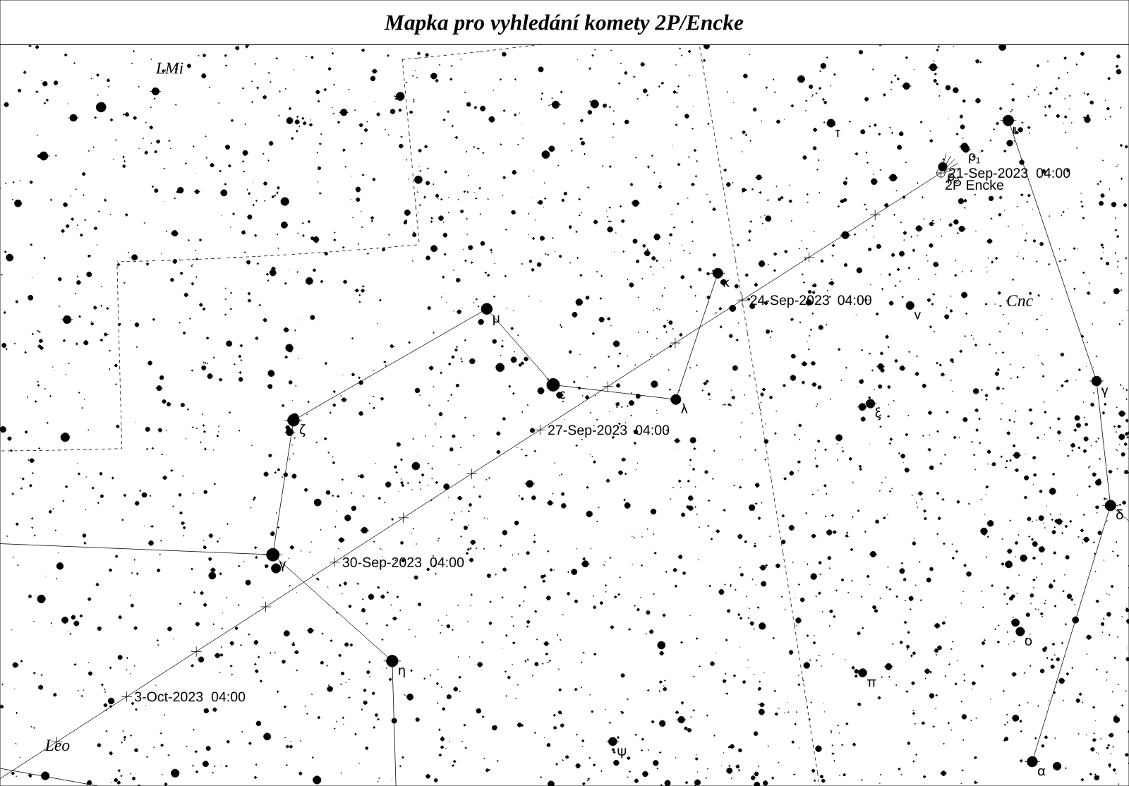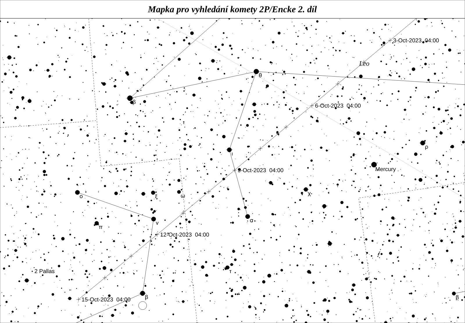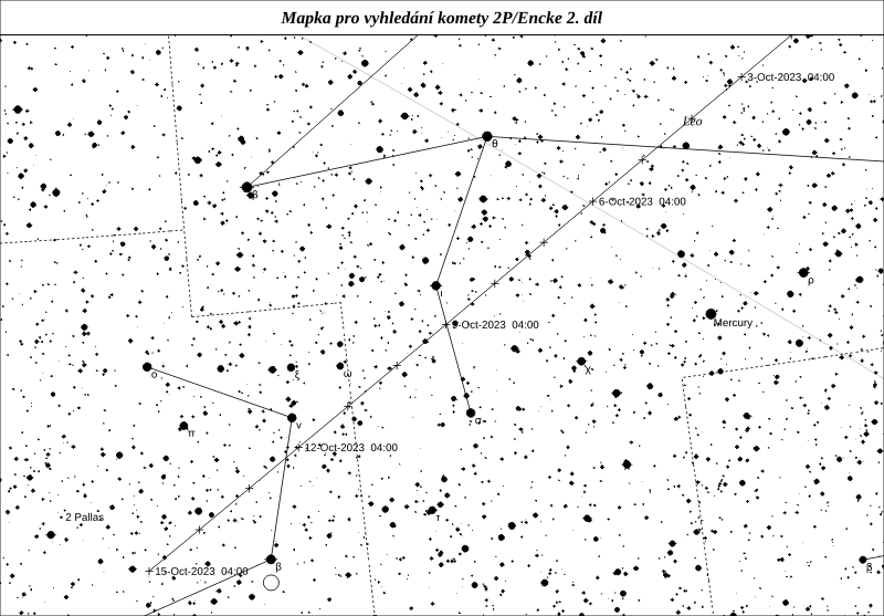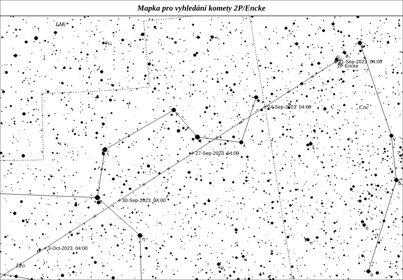 Kometa 2P/Encke patří k jedněm z mála komet, které se nejmenují po svém objeviteli. Tím byl v tomto případě Pierre Méchain z Francie, který ji objevil 17. ledna 1786. Následně ji při dalších návratech objevili v letech 1795 (Herschel), 1805 (Pons) a 1818 (Pons) jako novou kometu a nikdo netušil, že se jedná o tentýž objekt. To zjistil následně až J. F. Encke a tím získal nárok na pojmenování komety po něm. Enckeho kometa se nachází ve vnitřní části Sluneční soustavy, a tak nepatří do Jupiterovy rodiny komet. Její dráha je poměrně stabilní, má velké jádro, ale to není moc aktivní. Budí se, až když je blíže Slunci. Tomu se přibližuje na vzdálenost okolo 0,34 au každých 3,3 roku. Díky tomu můžeme v průběhu staletí pozorovat rychlé vyhasínání komety. U této komety bylo pozorováno negravitační zkracování oběžné doby, což v roce 1950 vysvětlil F. Whipple teorií tryskového motoru, tj. efekty plynu sublimujícího z povrchu jádra. Jedná se o mateřskou kometu celého komplexu meteorických rojů, z nichž nejznámější jsou podzimní Tauridy. Letošní návrat je velmi příznivý pro pozorovatele ze severní polokoule. Kometu budeme moci pozorovat s jasností okolo 8 mag.