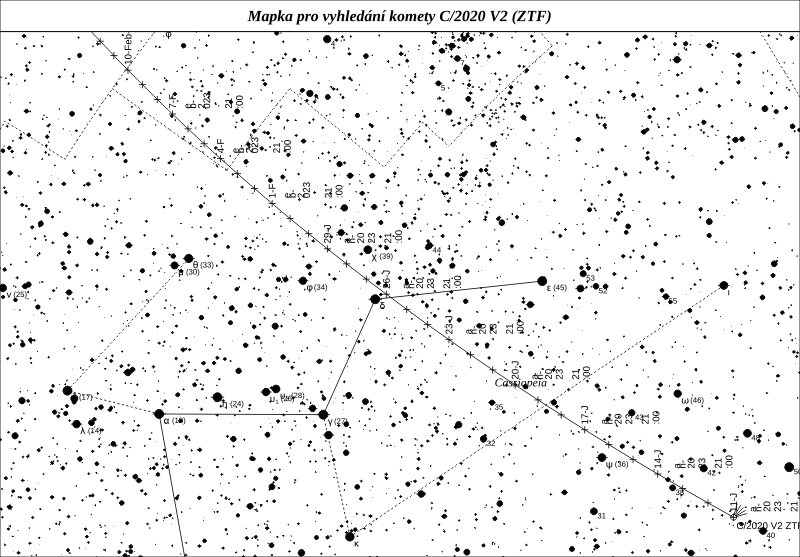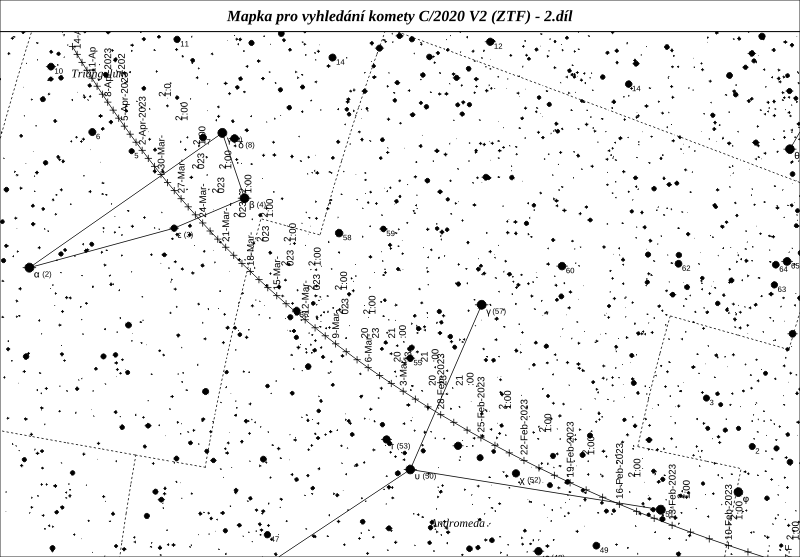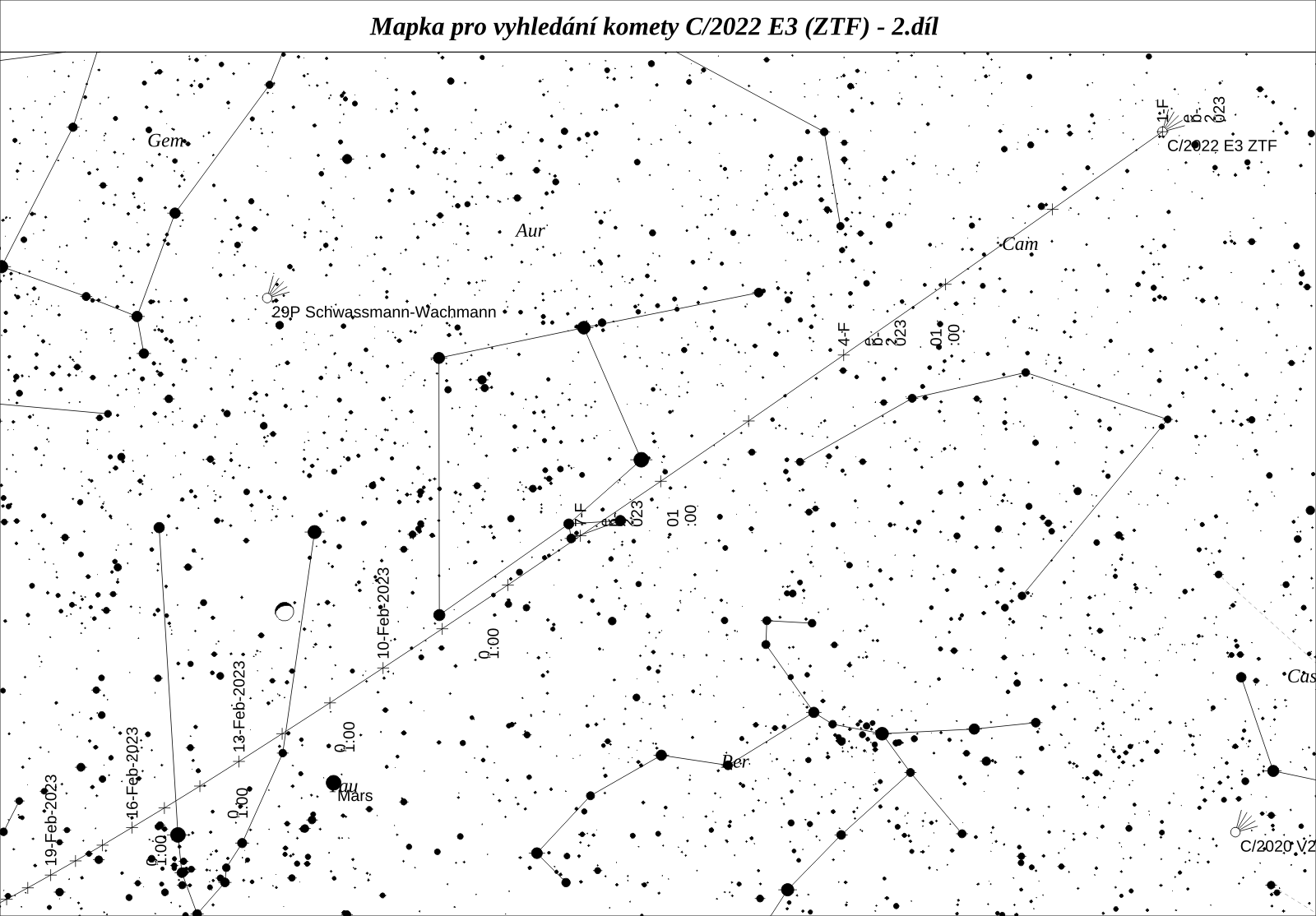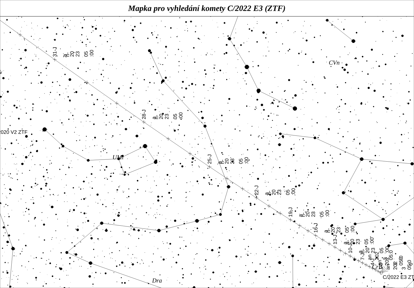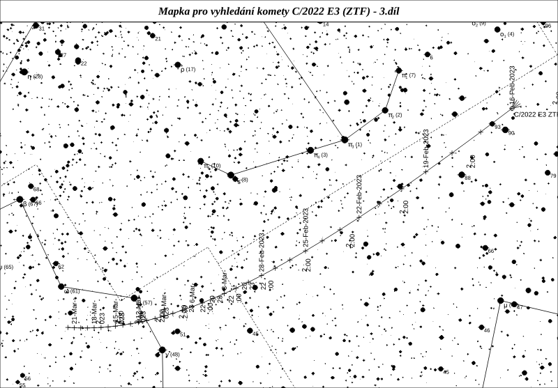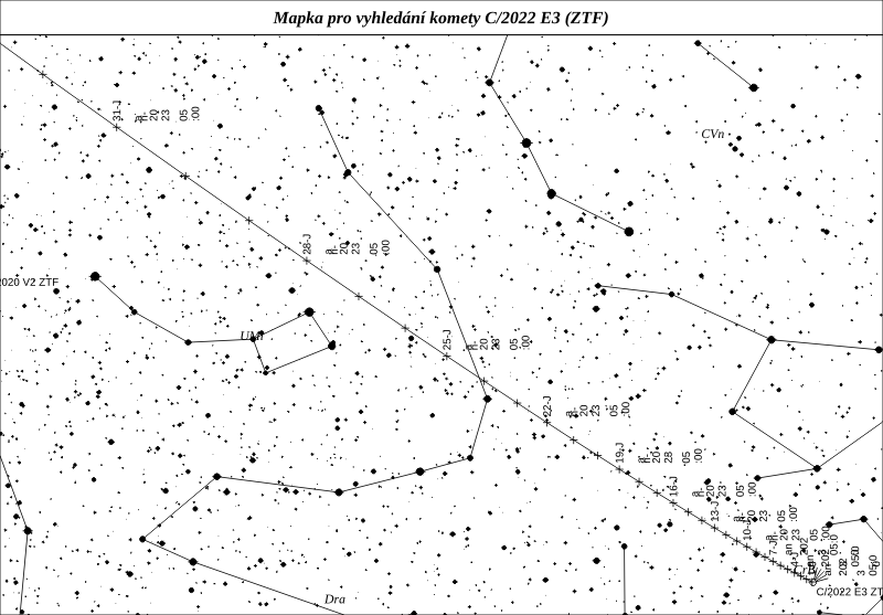 Zato další kometa objevená stejným projektem 2. května 2022 - C/2022 E3 (ZTF) - bude nejspíš hitem letošního roku! Nejedná se o dynamicky novou kometu z Oortova oblaku, ale o kometu na protáhlé dráze s periodou zhruba 47 tisíc let. Zatímco dynamicky nové komety dost často zklamou, dlouhoperiodické komety plní předpovědi lépe. Kometa projde perihelem ve vzdálenosti jen 1,11 au a chvíli poté projde jen 0,3 au od Země. Nejspíše dosáhne jasnosti okolo 5 mag a bude na hranici viditelnosti pouhým okem ve výborné poloze na obloze.
