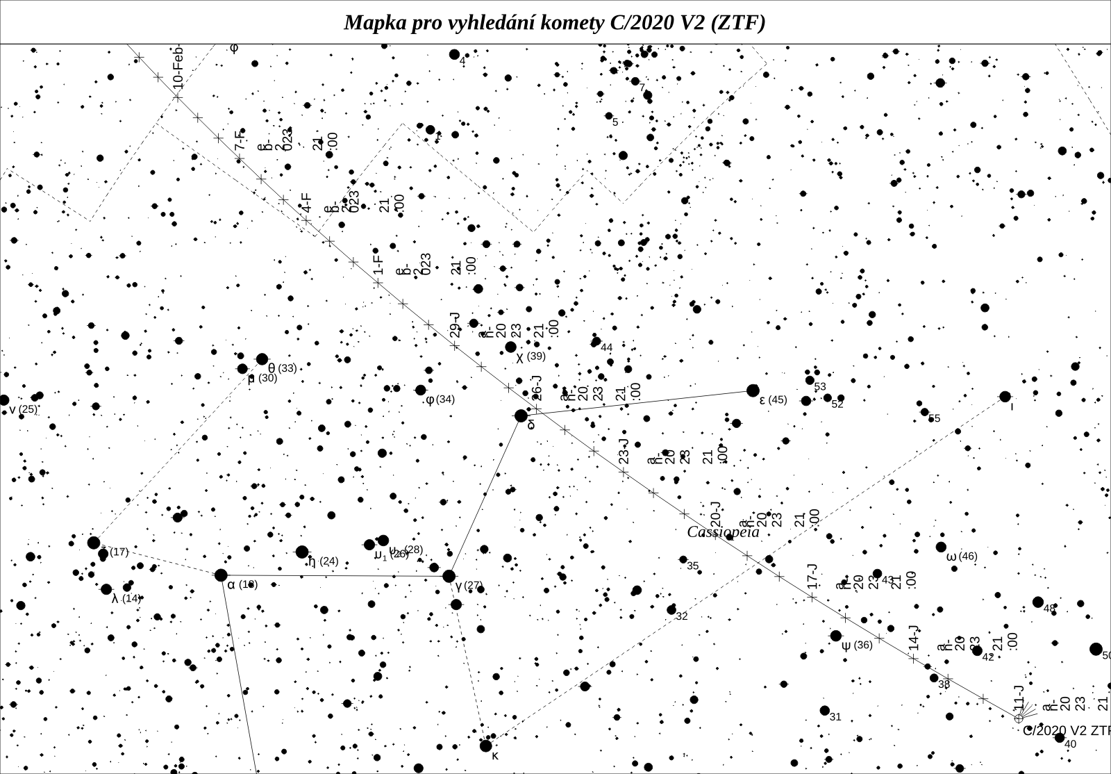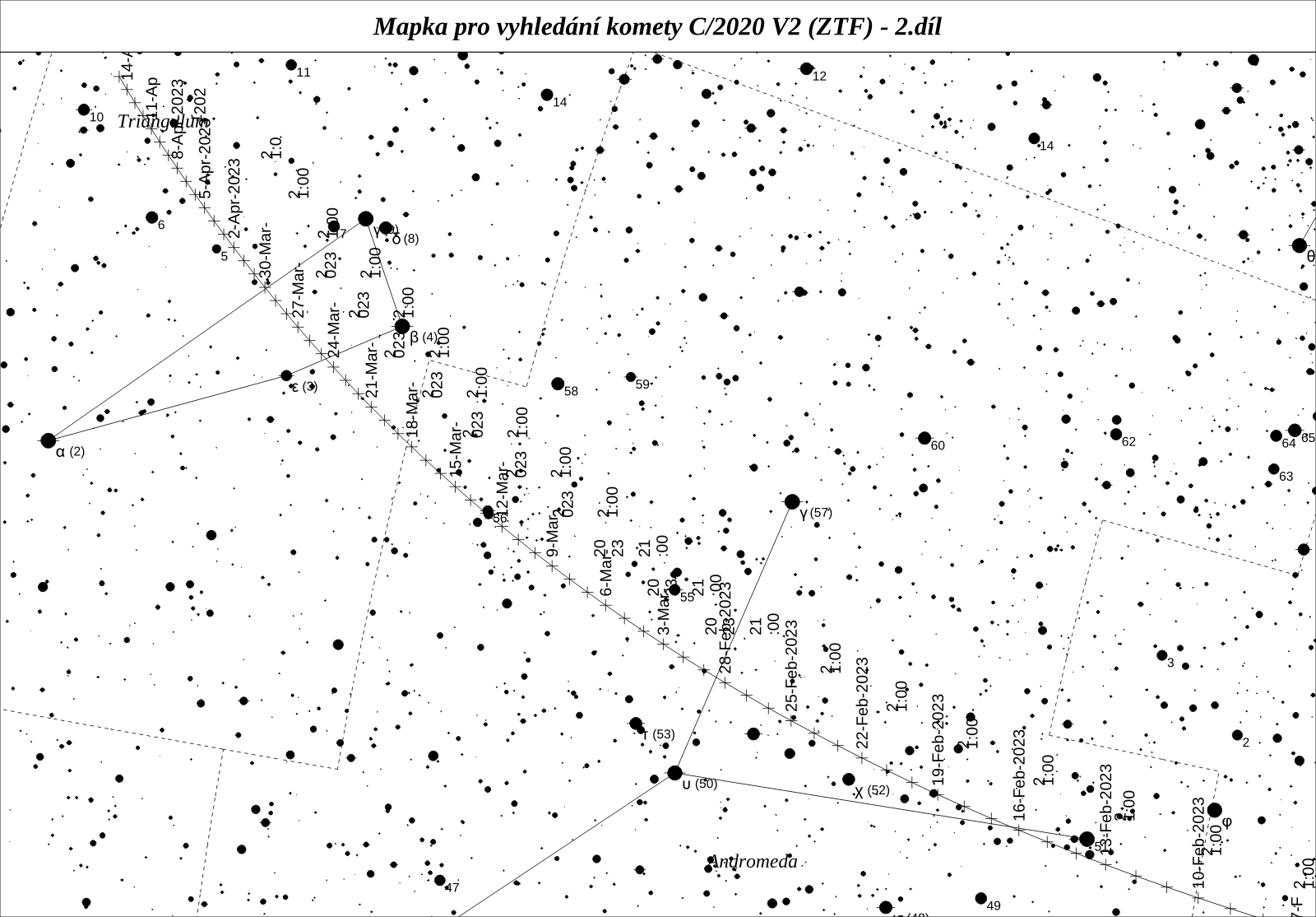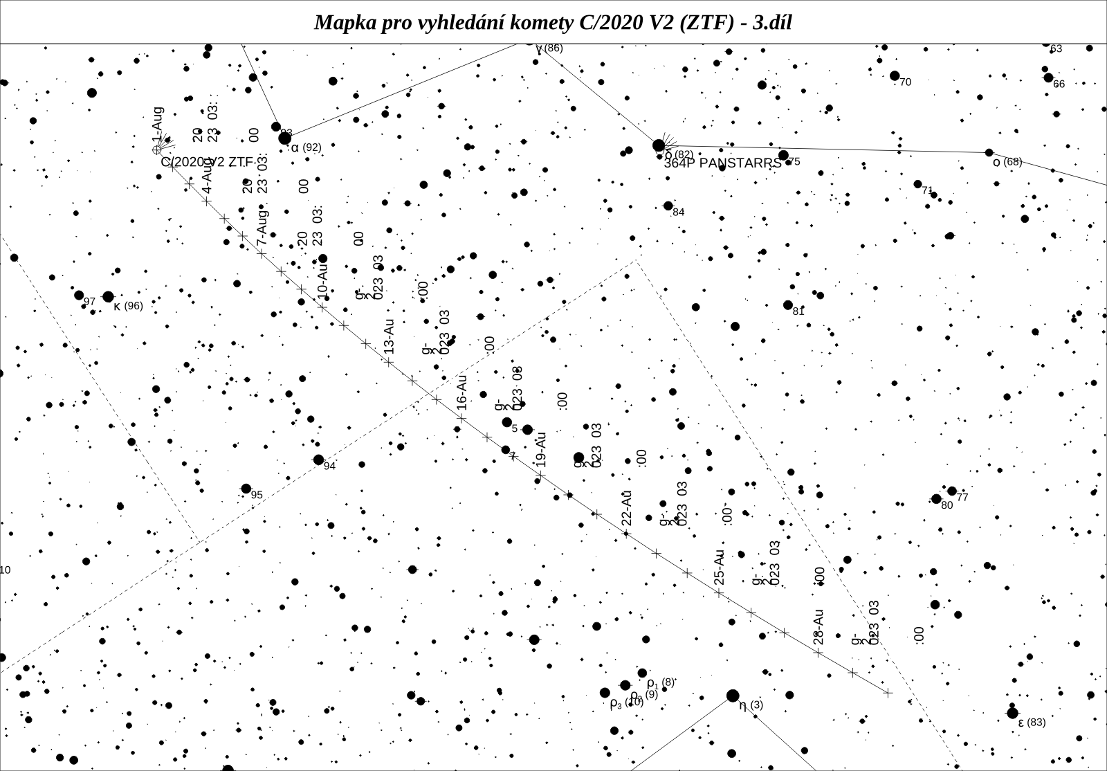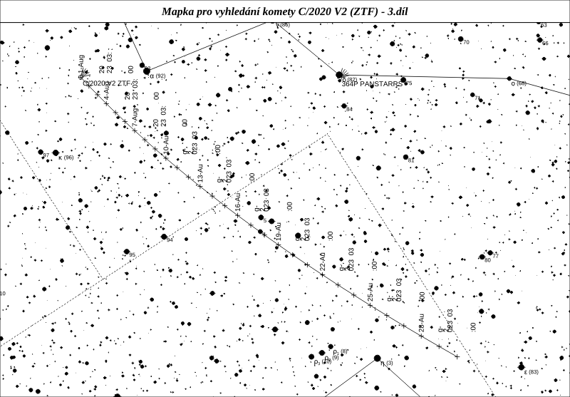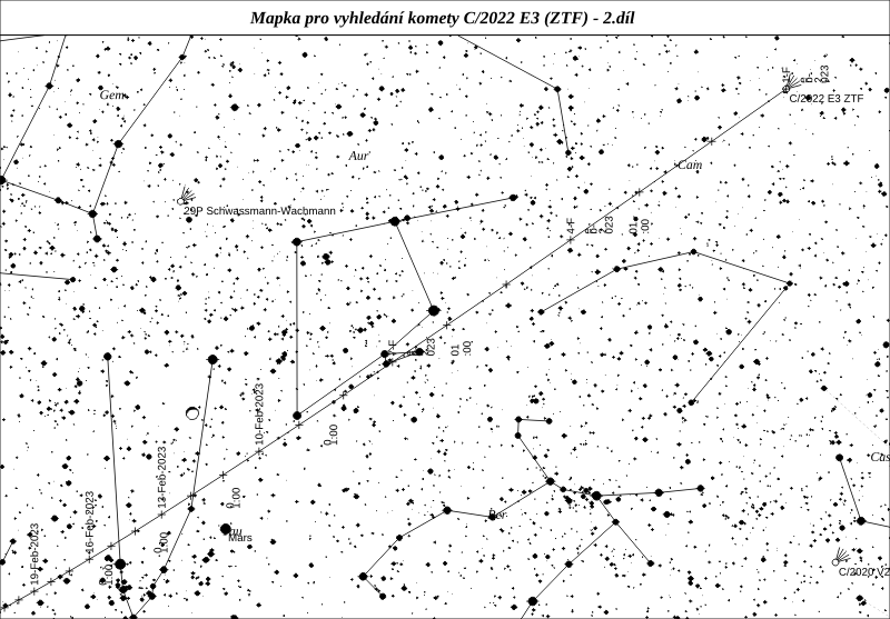 Zato další kometa objevená stejným projektem 2. května 2022 - C/2022 E3 (ZTF) - bude nejspíš hitem letošního roku! Nejedná se o dynamicky novou kometu z Oortova oblaku, ale o kometu na protáhlé dráze s periodou zhruba 47 tisíc let. Zatímco dynamicky nové komety dost často zklamou, dlouhoperiodické komety plní předpovědi lépe. Kometa projde perihelem ve vzdálenosti jen 1,11 au a chvíli poté projde jen 0,3 au od Země. Nejspíše dosáhne jasnosti okolo 5 mag a bude na hranici viditelnosti pouhým okem ve výborné poloze na obloze.