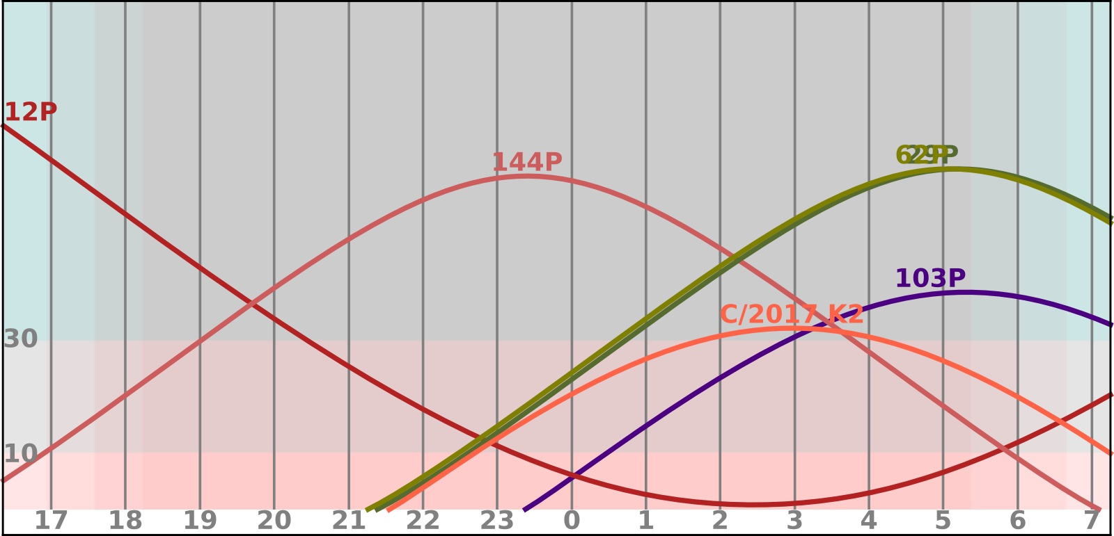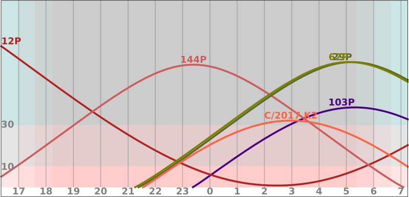 12P/Pons-Brooksbude pomalu zjasňovat k 12 mag a nalezneme ji večer v souhvězdí Herkula. Dodosahu menších dalekohledů se s 13 mag dostane nově 144P/Kushida, nalezneme ji v Beranu. Ostatní kometynalezneme opět na ranní obloze. Nejjasnější bude již slábnoucí k 8 mag 103P/Hartley v Hydře. Ve výborné poloze v Raku se pak budenacházet s jasností 8,5 mag 62P/Tsuchinshan, ve stejnémsouhvězdí nalezneme i 29P/Schwassmann-Wachmann. Stále vJednorožci bude C/2017 K2 (PANSTARRS)(kolem 13 mag).