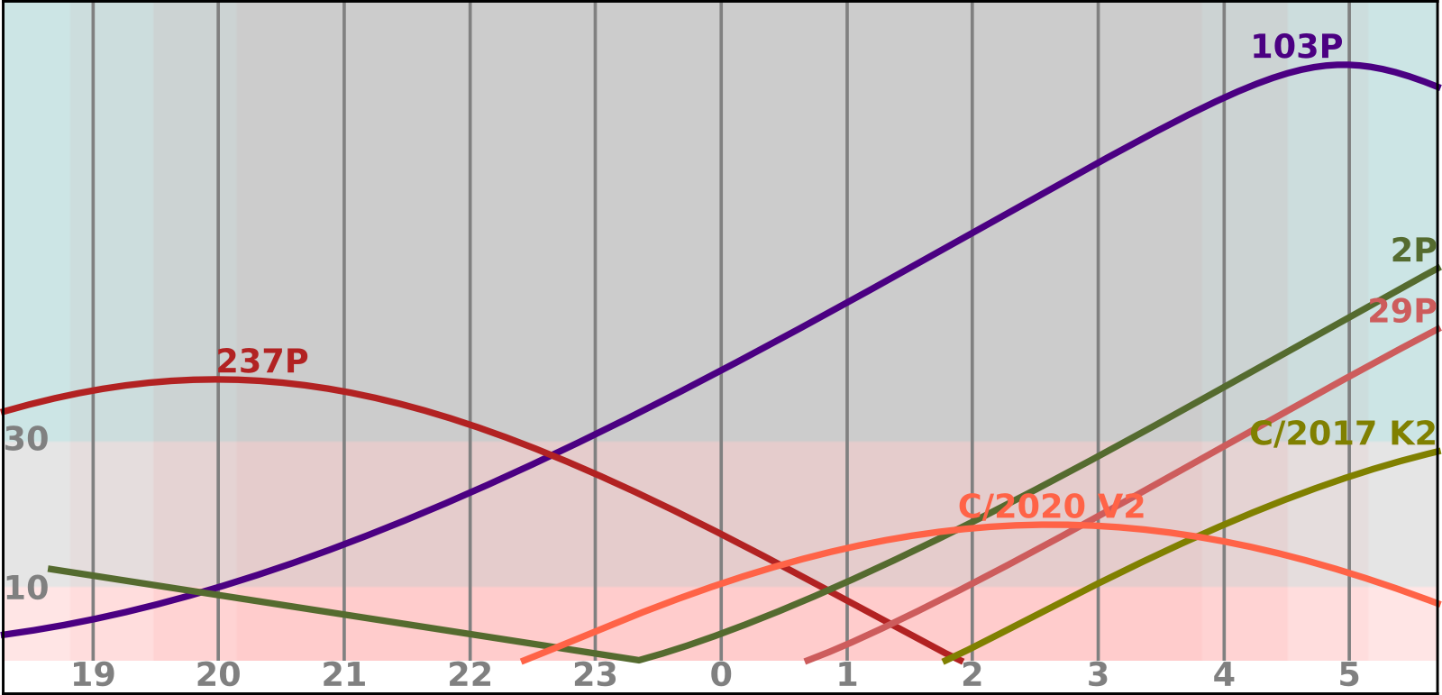 Na večerní obloze ještě můžeme naposledy spatřit 237P/LINEAR, s jasností okolo 12,5 mag ji nalezneme vOrlu. Na ranní obloze bude k obzoru už klesat s jasností 9,5 mag C/2020 V2 (ZTF), nalezneme ji ve Velrybě. Hitem v tomtoobdobí bude 103P/Hartley, lehce jasnější 9 mag bude vysokonad obzorem v souhvězdí Persea a Vozky. Z Blíženců do Raka se pak budepohybovat 2P/Encke s jasností okolo 10,5 mag. Nízko nadobzorem v Jednorožci pak bude teoreticky pozorovatelná i C/2017 K2 (PANSTARRS) s jasností okolo 12,5 mag.