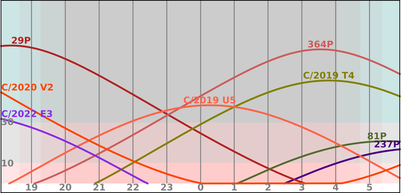 Zhruba stejnou jasnost okolo 10 mag budou mít na večerní obloze kometyC/2020 V2 (ZTF) a slábnoucí C/2022 E3 (ZTF). První bude na pomezí Andromedy aTrojúhelníku, druhá v Eridanu. Na hranici Blíženců a Vozky bude stále 29P/Schwassmann-Wachmann. Okolo půlnoci budeme mocipozorovat v Panně C/2019 U5 (PANSTARRS) okolo 12 mag.Stejnou jasnost kolem 13 mag bude mít C/2019 T4 (ATLAS) a 364P/PANSTARRS, první nalezneme v souhvězdí Hada, druhou vPastýři. Jasnější, kolem 12 mag, ale níž nad obzorem bude 237P/LINEAR a 81P/Wild ve Střelci,respektive Hadonoši.