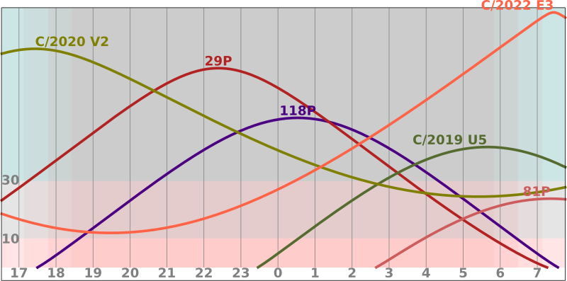 Na večerní obloze nalezneme vysoko na obloze v Kasiopeji jasnou kometu C/2020 V2 (ZTF) s jasností okolo 9,5 mag. Na rozmezí Vozkya Blíženců se nachází 29P/Schwassmann-Wachmann. Okolopůlnoci nalezneme v souhvězdí Raka 118P/Shoemaker-Levy sjasností okolo 12 mag. Na ranní obloze nalezneme po průchodu perihelemkometu C/2022 E3 (ZTF) na prahu viditelnosti pouhým okem sjasností větší než 6 mag. Jak se přibližuje Zemi, přejde rychle zesouhvězdí Pastýře do Draka, Malé medvědice až do Žirafy. Ve Vaháchnalezneme s jasností kolem 11,5 mag kometu 81P/Wild. VPanně nalezneme ještě slabou C/2019 U5 (PanSTARRS) sjasností jen 13 mag.
