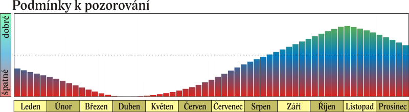 Na začátku roku 2023 je Jupiter pozorovatelný na večerní obloze. Počátkem ledna se na konci občanského soumraku blíží kulminaci ve výšce 39° a v průběhu ledna a února je večer vysoko nad JZ obzorem. Pohybuje se přímo souhvězdím Ryb, z nějž se ve druhé polovině května přesune do Berana. V tomto souhvězdí pak vydrží až do konce roku.
