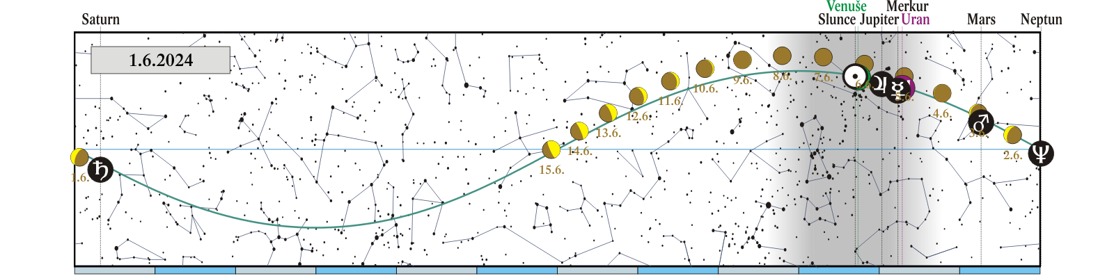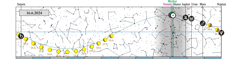 Měsíc v konjunkci se Saturnem (Saturn 0,50° severně; 27. a 28. 6. ráno Měsíc, Saturn a Neptun) |