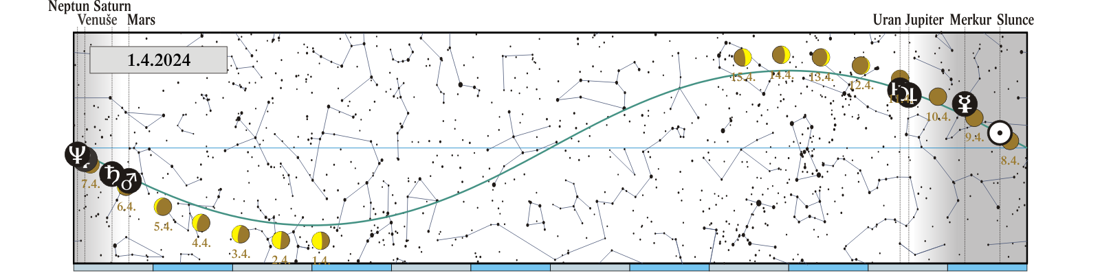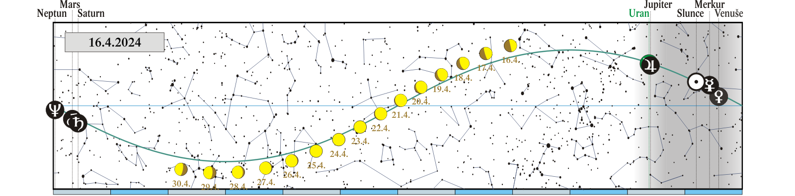 Měsíc v konjunkci s α Vir (Spica 0,45° jižně; ráno nad JZ obzorem) |