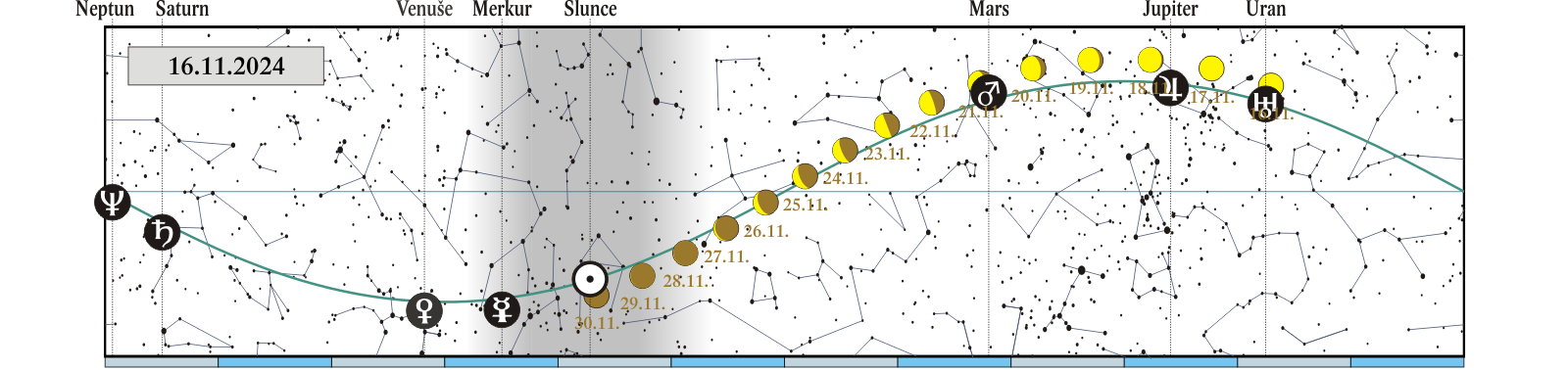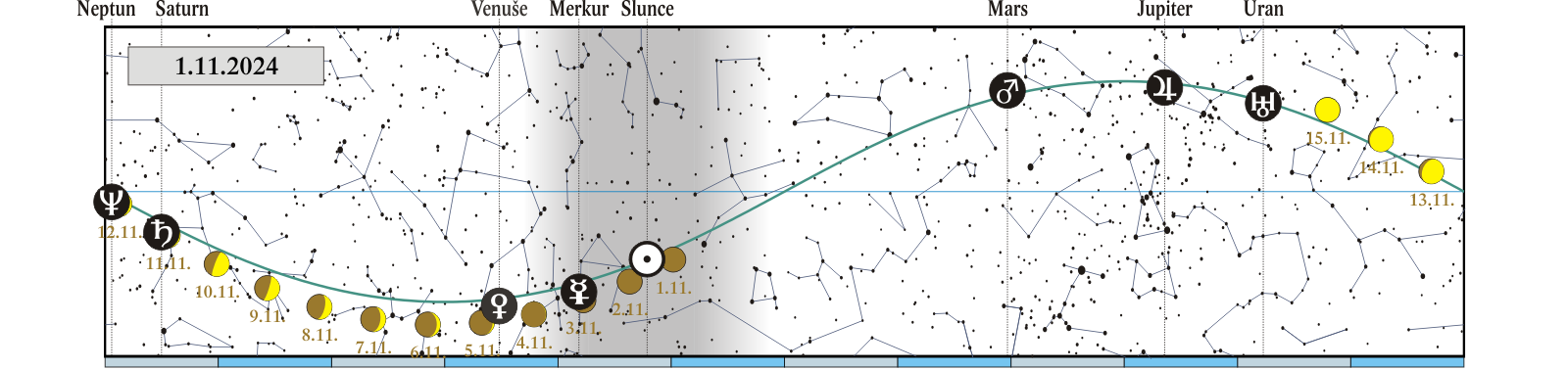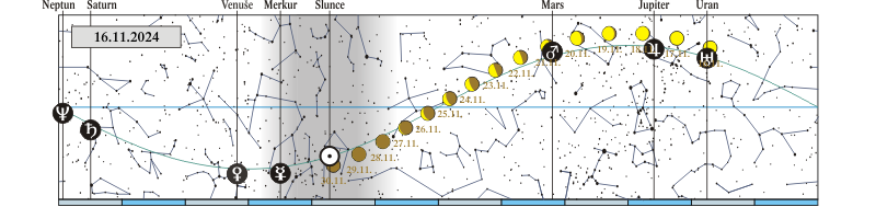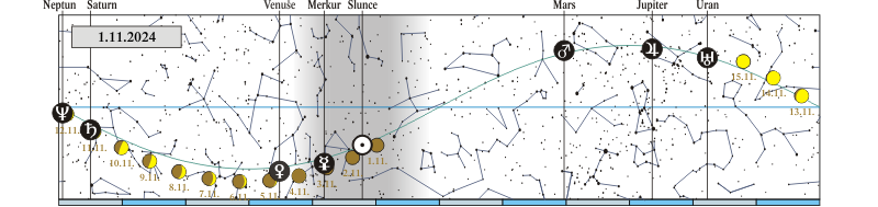 Měsíc v konjunkci se Saturnem (Saturn 0,29° severně; 10. 11. před půlnocí) |