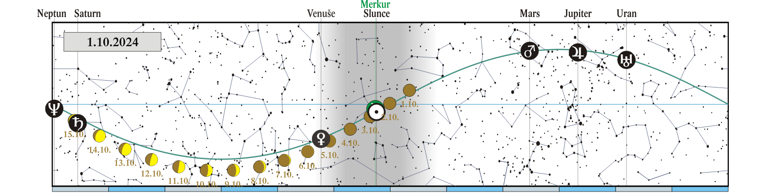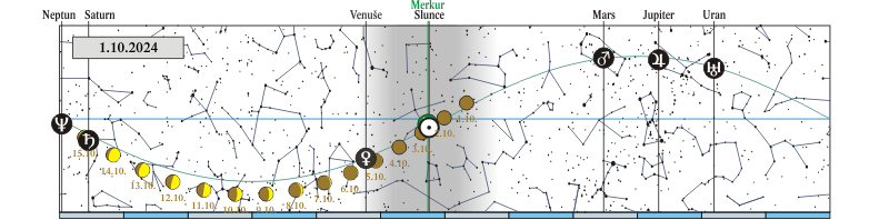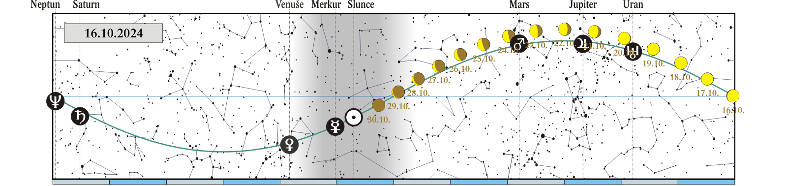 Měsíc v konjunkci s Neptunem (Neptun 0,47° severně; večer nad JV obzorem) |