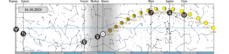 Měsíc v konjunkci s Marsem (Mars 3,14° jižně; 23. a 24. 10. ve druhé polovině noci Měsíc Mars a Pollux) |