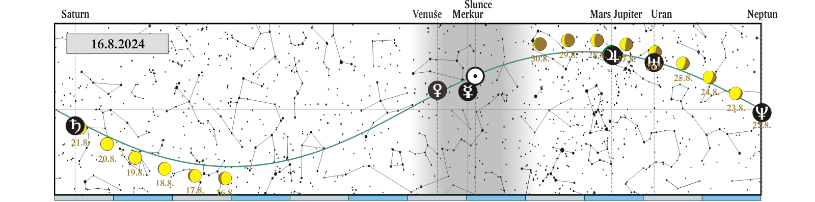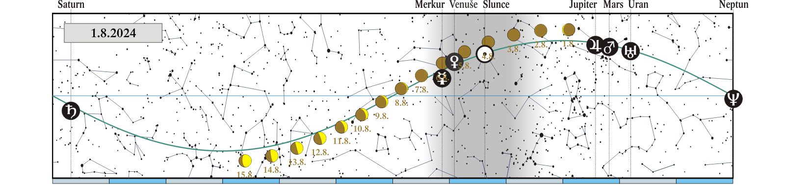 Měsíc v konjunkci s α Vir (Spica 0,27° jižně; 9. a 10. 8. večer nízko nad JZ obzorem) |