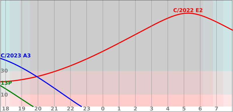 Kometa C/2023 A3(Tsuchinshan-ATLAS) v tomto období zeslábne z 3,5 na 7mag, stejně tak bude slábnout plošná jasnost ohonu. Celou dobu jinalezneme v souhvězdí Hadonoše v uspokojivé výšce nad obzorem.Na ranní obloze, téměř v nadhlavníku na rozhraní Rysa a Žirafy,spatřímeC/2022 E2 (ATLAS) s jasností okolo 12,5 mag. Narozhraní Lva a Sextantu by mohla prolomit 13 mag333P/LINEAR.Ráno ve Lvu bude opět pozorovatelná 29P/Schwassmann-Wachmann.