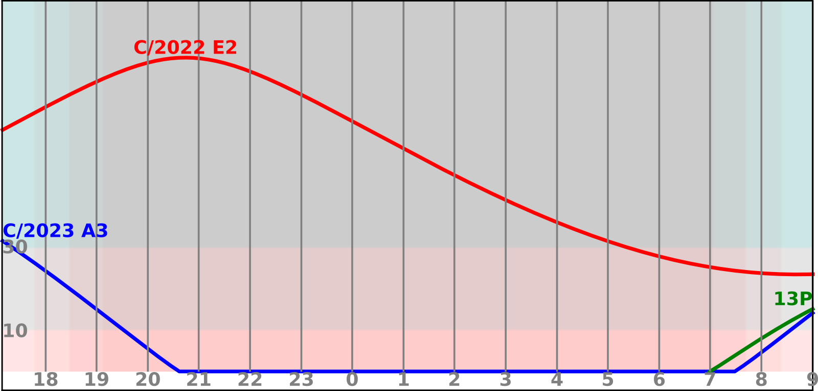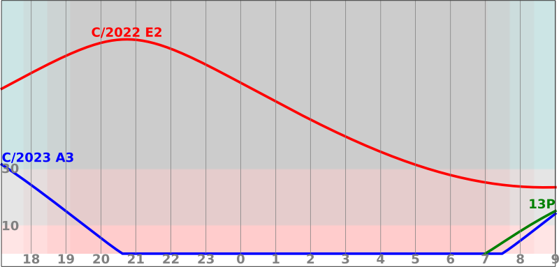 Na večerní oblozese budeme loučit s kometou C/2023 A3 (Tsuchinshan-ATLAS),jasnost klesne k 10 mag a pozorovací podmínky se začnou výraznězhoršovat. Nalézat se bude v souhvězdí Orla. C/2022 E2 (ATLAS)bude nejlépe pozorovatelná večer v Kasiopeji, a jasnost budezvolna klesat k 13 mag. Jedinou kometou pozorovatelnou na ranníobloze bude29P/Schwassmann-Wachmann ve Lvu.
