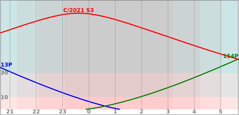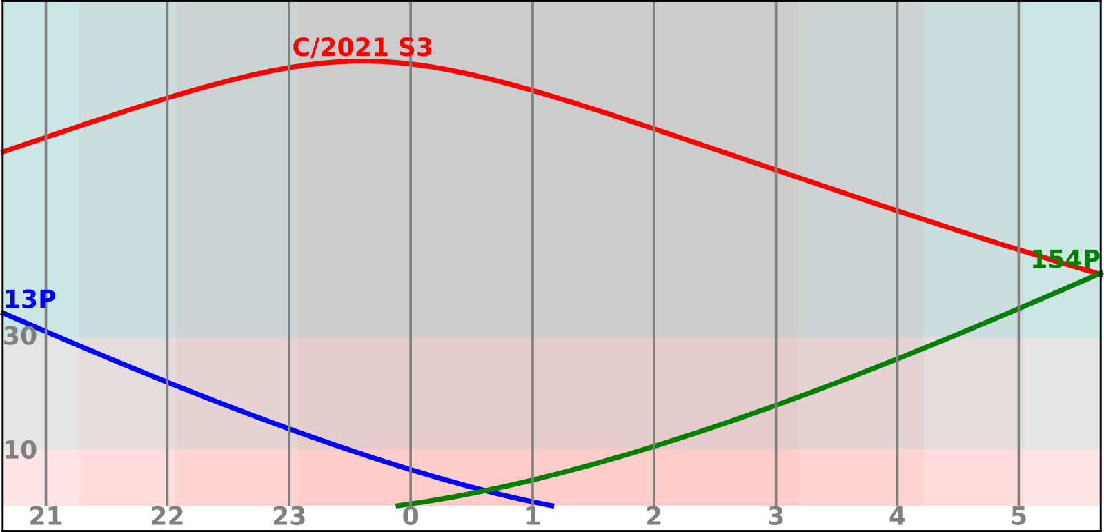 Na večerní oblozese bude zlepšovat viditelnost 13P/Olbersv souhvězdí VelkéMedvědice, i když už bude slábnout (bude jen lehce slabší 7mag). Kometa C/2021 S3 (PANSTARRS) zeslábne ke 13mag.Nalezneme ji téměř v nadhlavníku, stále v souhvězdí Draka.Ráno se bude zlepšovat viditelnost 154P/Brewington veVozkovi, ale bude také slábnout k 13 mag.