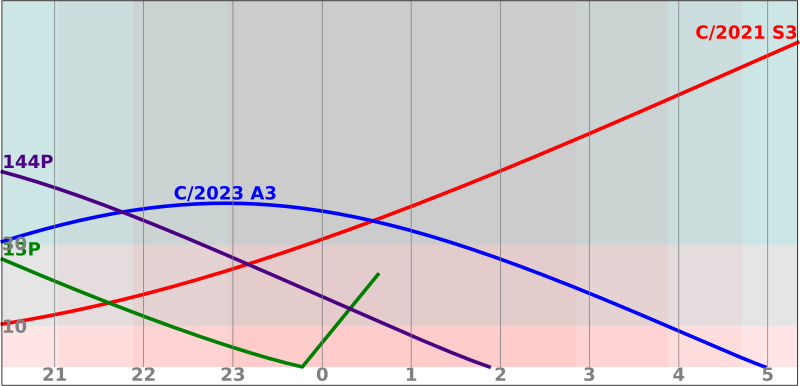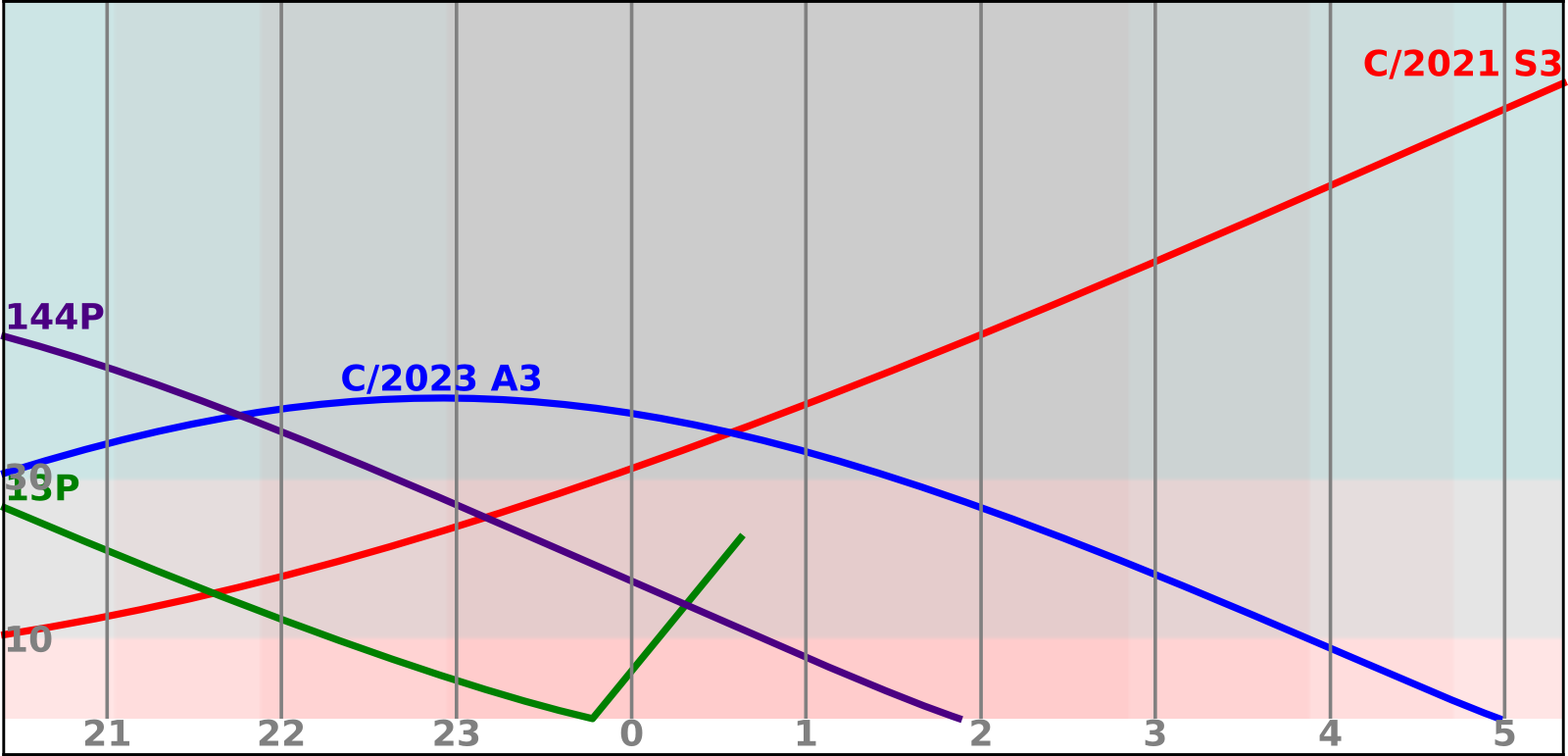 Na večerní oblozejiž jen nízko nad obzorem nalezneme zjasňující 13P/Olbers,bude se pohybovat z Býka do Vozky s jasností okolo 9 mag. V Raku semůžeme rozloučit s kometou 144P/Kushida, která bude mítjasnost už jen okolo 13 mag. V témže souhvězdí bude stálei 29P/Schwassmann-Wachmann. Večer budeme moci v Panněpozorovat C/2023 A3 (Tsuchinshan-ATLAS)s jasností 10,5 mag.Na ranní obloze bude už jen slábnoucí C/2021 S3 (PANSTARRS).,Nalezneme ji ale v Labuti ve výborné poloze vysoko nad obzorems jasností mírně slabší 10 mag.