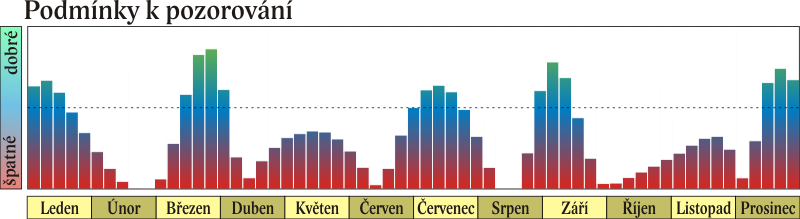 Následuje dlouhé období, kdy je Merkur nepozorovatelný. Při maximální západní elongaci (26°), která nastává 9. 5. ve 22 h, ani při největší východní elongaci (27°), v níž se planeta ocitá 22. 7. v 7 h, se nevymaní z červánků. Mezi těmito elongacemi nastává dne 14. 6. v 17 h horní konjunkce a poté 19. 8. ve 3 h dolní konjunkce se Sluncem.