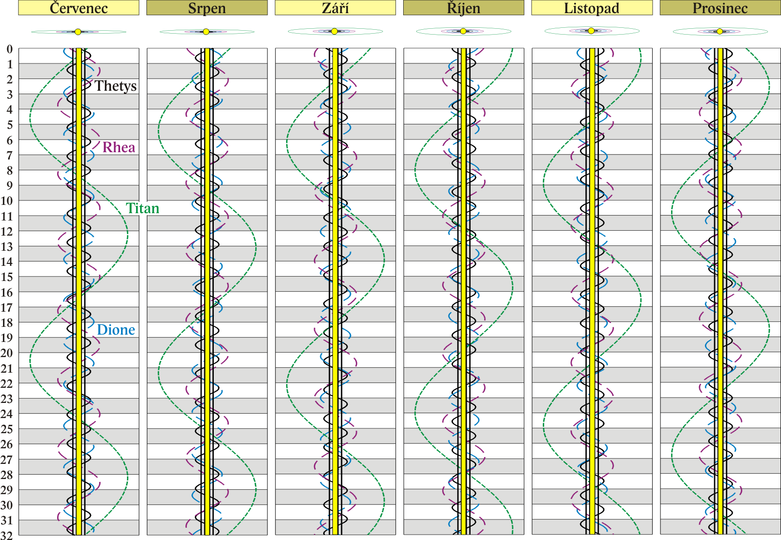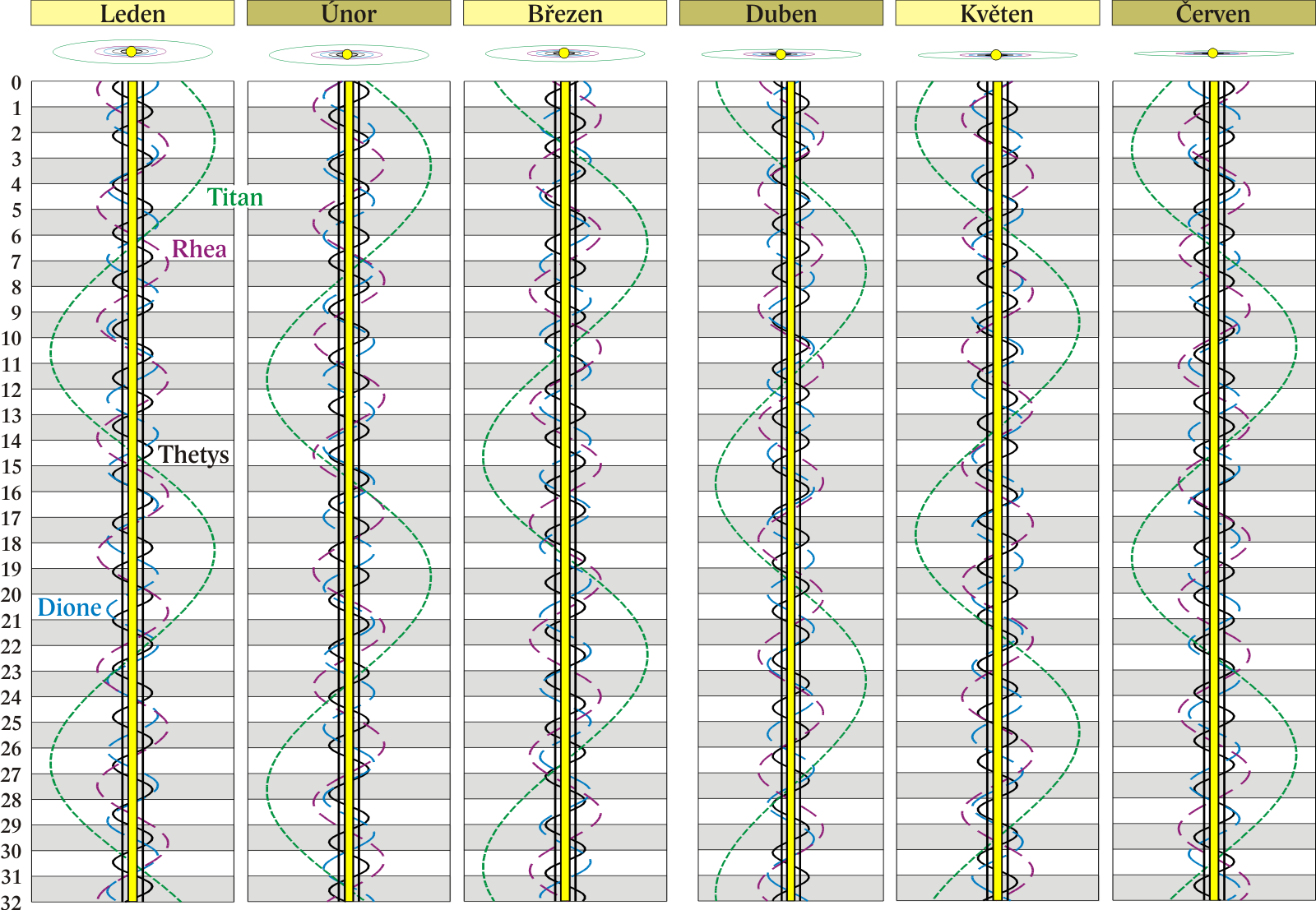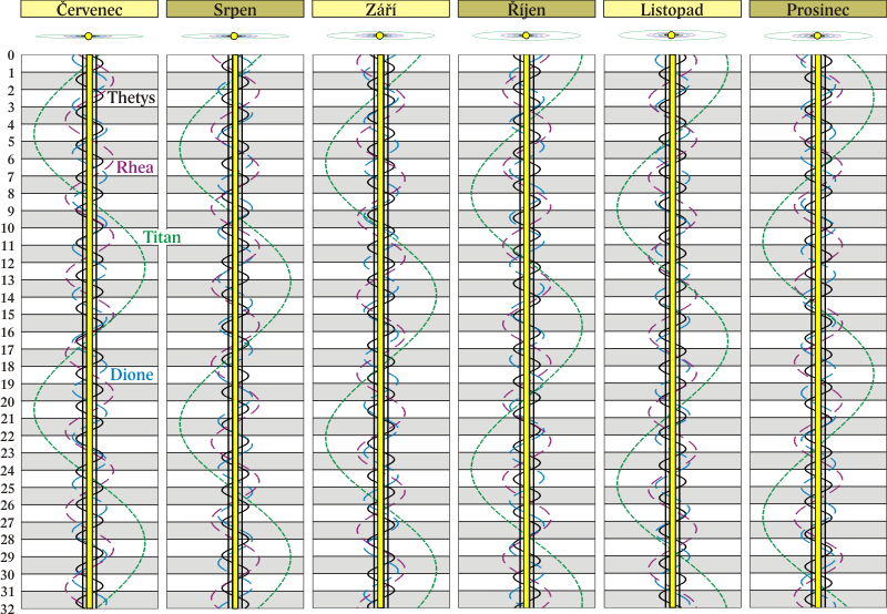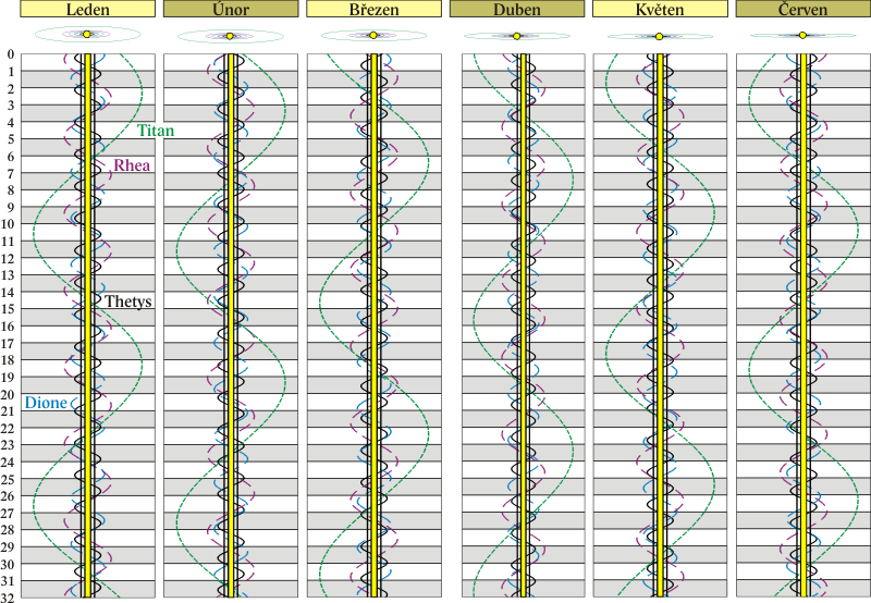 Grafy poloh čtyř největších měsíců Saturna.