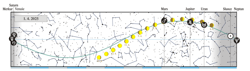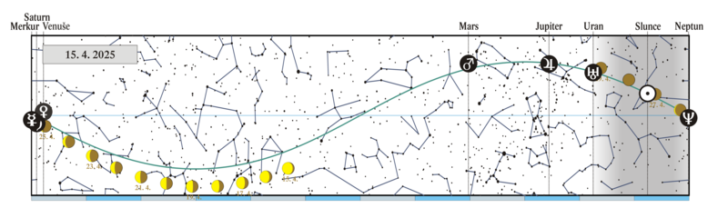 Měsíc v konjunkci s α Vir (Spica 1,33° severně, nad naším obzorem v noci) |
