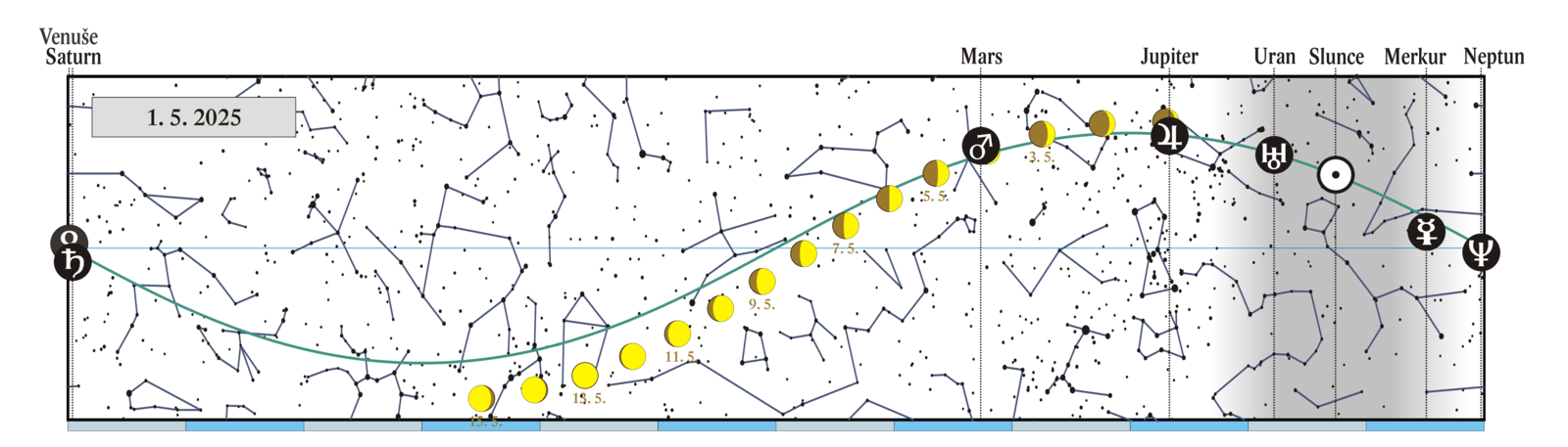 Měsíc v konjunkci s Venuší (Venuše 2,69° jižně, seskupení Měsíce, Venuše a Saturnu ráno nad V obzorem) |