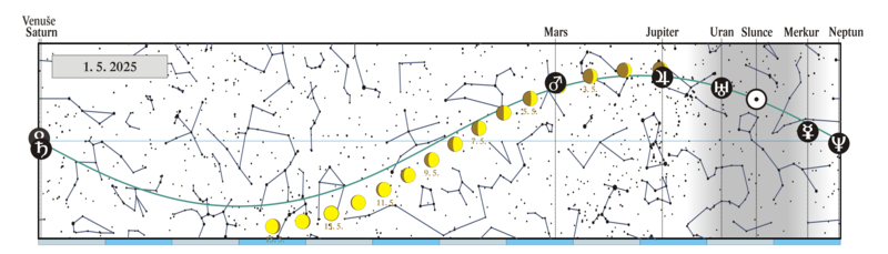 Měsíc v konjunkci s α Leo (Regulus 1,38° jižně, nad naším obzorem v noci) |