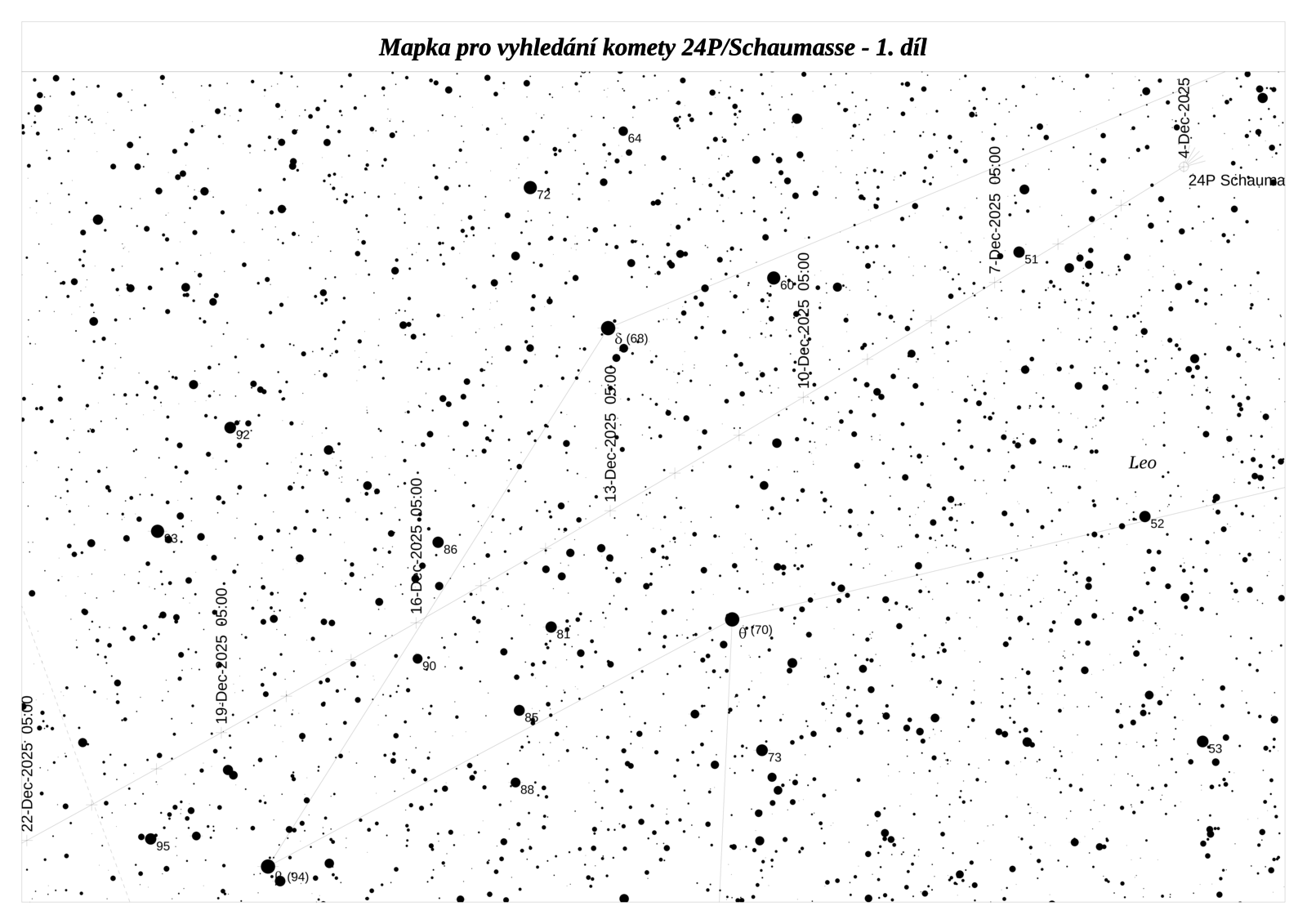 Kometu 24P/Schaumasse objevil Alexandre Schaumasse dne 1. prosince 1911. Kometa má poměrně stabilní dráhu, Jupiter mění spíše její orientaci v prostoru, ale perihel je poměrně stabilní, pohybuje se okolo 1,2 au. Tato kometa projde přísluním až v roce 2026, dobře pozorovatelná bude ale už letos. Čeká nás velice příznivý návrat této komety, při kterém se přiblíží k Zemi na vzdálenost 0,594 au a koncem letošního roku dosáhne jasnosti 9,1 mag.