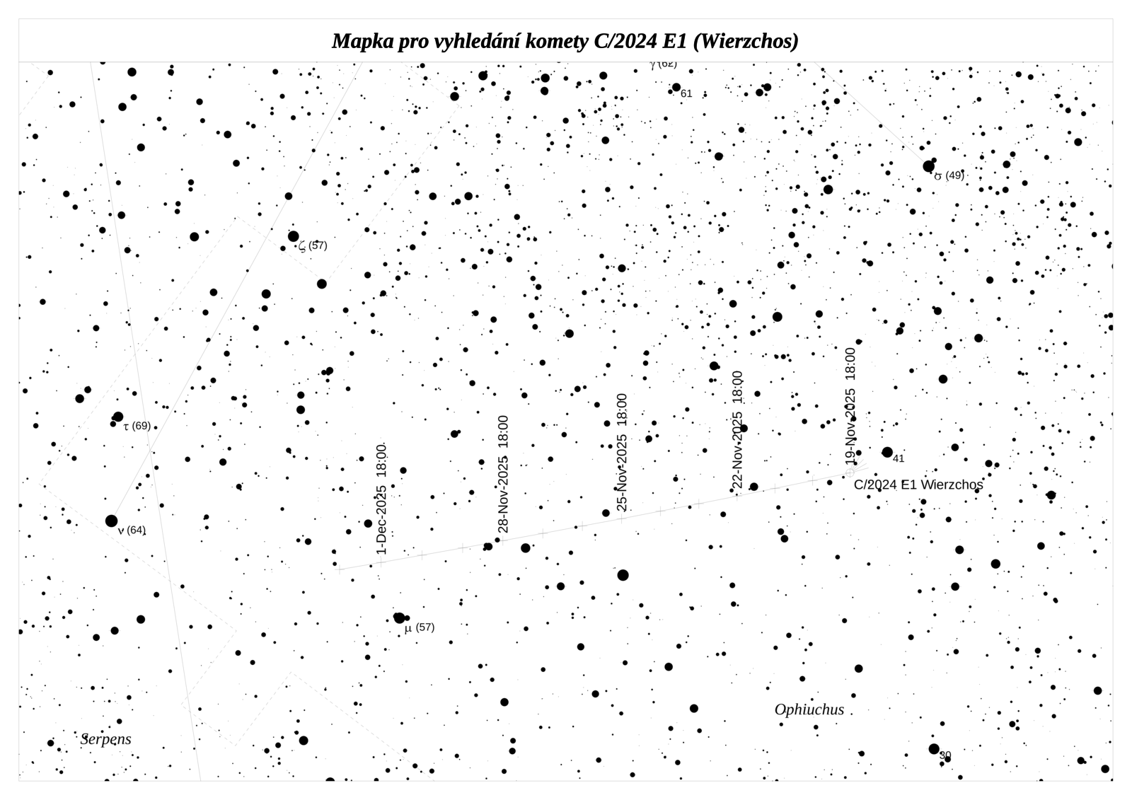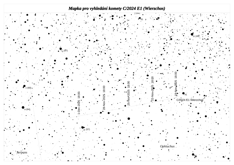 Kometu C/2024 E1 (Wierzchos) objevil Kacper Wierzchos dne 17. ledna 2024 pomocí teleskopu Catalina Sky Survey. Jedná o dynamicky novou kometu (stejně jako u předešlé), která přilétá z Oortova oblaku poprvé, i když v tomto případě přichází z vnitřnější části a není vyloučené, že už u Slunce někdy mohla být. Je to poměrně aktivní kometa, ale její letošní návrat je nepříznivý. Od Země si bude udržovat odstup 1,010 au a větší. V období maximální jasnosti u nás nebude pozorovatelná. Letos dosáhne jasnosti 9,4 mag, ale v nepříznivé poloze jen nízko nad obzorem, jasnější bude až následující rok, kdy také prochází přísluním.