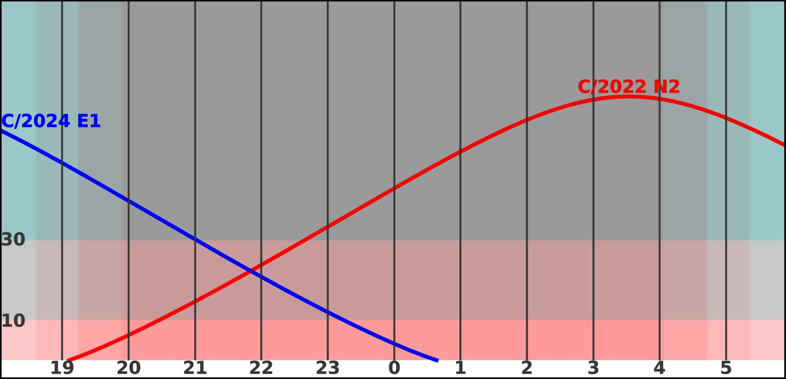 Na večerní obloze se objeví kometaC/2024 E1 (Wierzchos), bude na pomezí Severní koruny a Herkula a její jasnost dosáhne 12,5 mag.Na ranní obloze bude mít zhruba stejnou jasnostC/2022 N2 (PANSTARRS)v souhvězdí Býka.