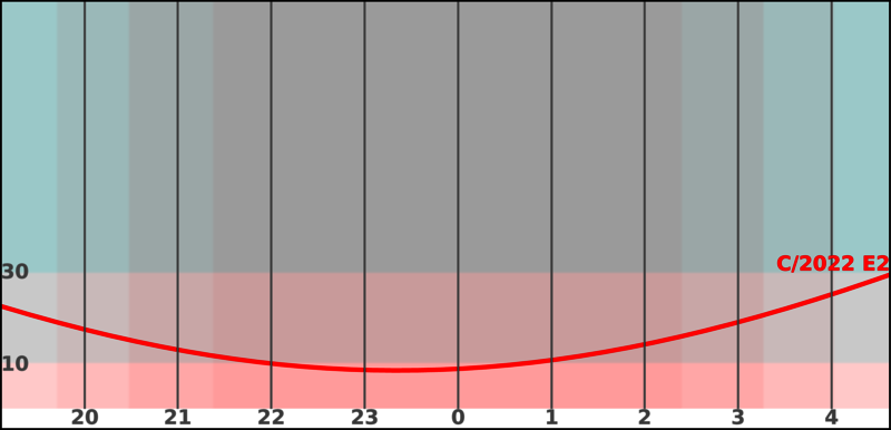 Již jen teoreticky bude na večerní obloze pozorovatelnáC/2022 E2 (ATLAS), kterou nalezneme jen nízko nad obzorem v souhvězdí Andromedy s jasností13 mag.