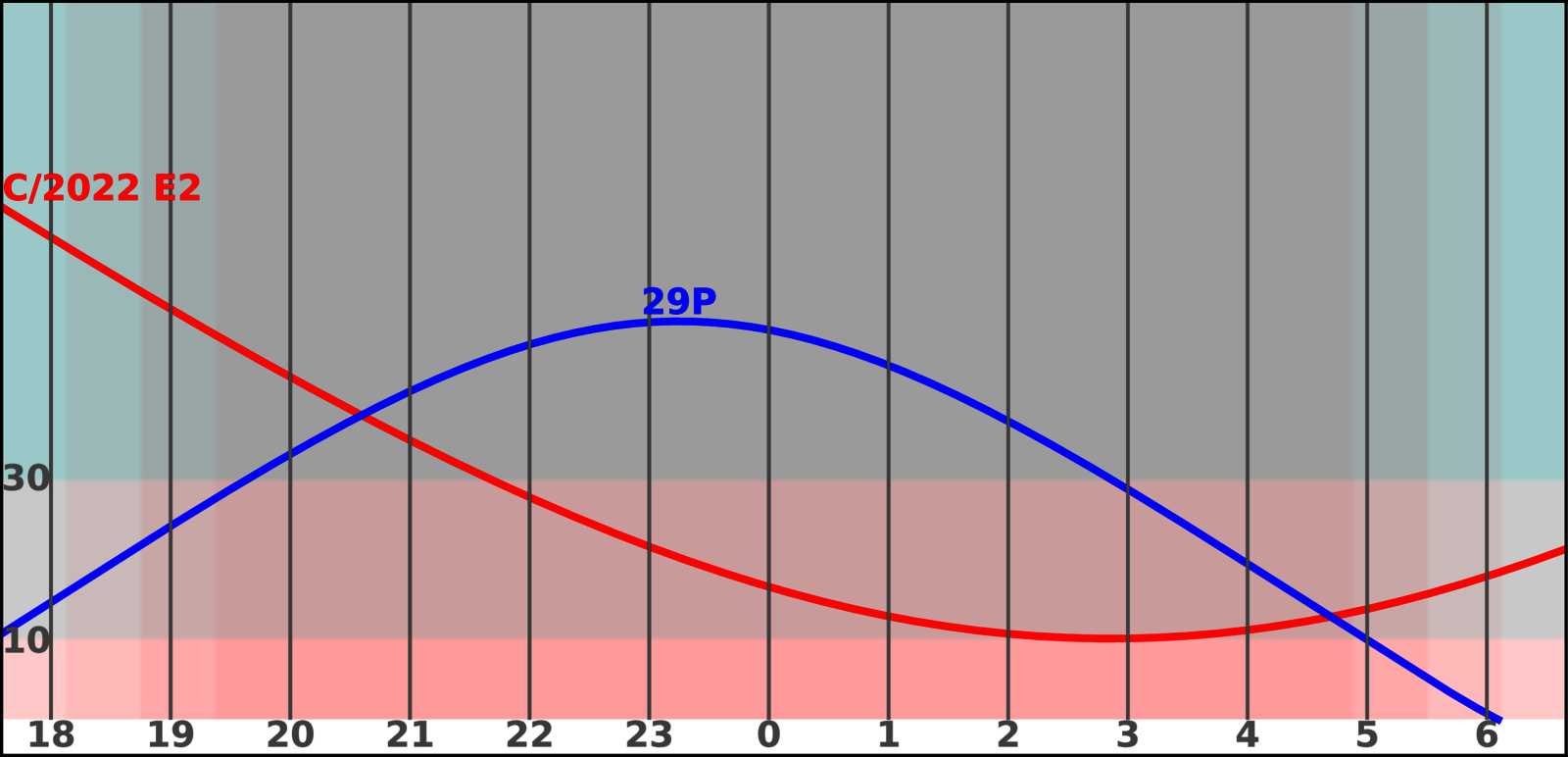 Slábnoucí (12.5 mag) C/2022 E2 (ATLAS) se navečerní obloze posune z Kasiopeji do Andromedy. Na večerní oblohu se pomalupřesouvá 29P/Schwassmann-Wachmann, kterou stále najdeme vsouhvězdí Lva.
