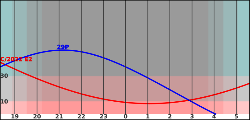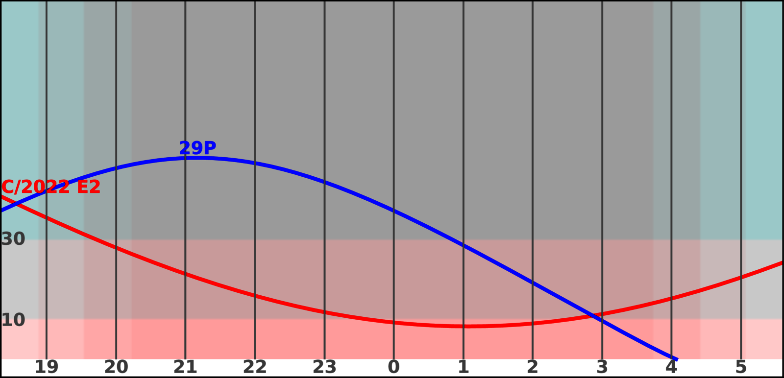 Pozorovací podmínky C/2022 E2 (ATLAS) se budouvýrazně horšit. Nalezneme ji v Andromedě jen nízko nad obzorem večer sjasností téměř 13 mag. Výše nad obzorem, taktéž večer, nalezneme ve Lvu29P/Schwassmann-Wachmann.