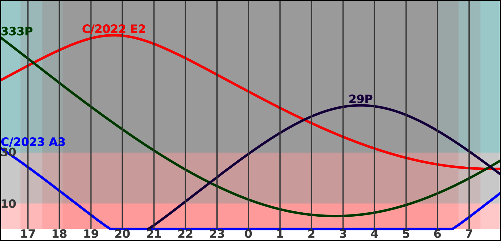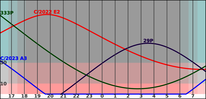 Vzhledem k tomu, že nov nastává těsně před koncem roku, zařazujeme do tétoročenky i poslední lunaci z roku loňského. Téměř všechny komety budoupozorovatelné na večerní obloze, budou slabší, vizuálně v dosahu střednícha větších dalekohledů. Nejjasnější kometou by měla být vzdálenáC/2022 E2 (ATLAS), s jasností kolem 12 mag ji najdeme v Kasiopeji. Podobně jasná, ale vpodstatně horší poloze nízko nad obzorem v souhvězdí Orla, bude jižzesláblá velká kometa loňského roku -C/2023 A3 (Tsuchinshan-ATLAS). Nejslabší, ale v dobré poloze v Labuti, nalezneme již slábnoucí (12,5mag) 333P/LINEAR. Jedinou kometou na ranní obloze budevzdálená kometa 29P/Schwassmann-Wachmann v souhvězdí Lva.