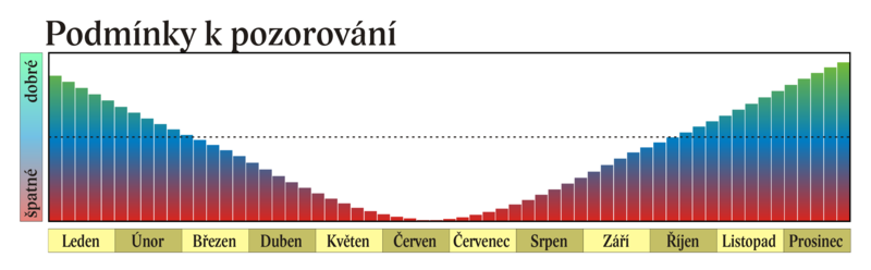 Po loňské prosincové opozici je Jupiter na začátku roku 2025 nad obzorem po celou astronomickou noc a současně je pro tento rok nejjasnější (-2,8 mag). Pohybuje se zpětně souhvězdím Býka. Dne 4. 2. ve 14 hodin je Jupiter stacionární a jeho pohyb mezi hvězdami se mění na přímý. Během února a března se viditelnost největší planety Sluneční soustavy přesouvá do večerních hodin. S večerní oblohou se Jupiter rozloučí v květnu. V polovině měsíce je na konci občanského soumraku ve výšce 14° nad západním obzorem a na počátku června už je nepozorovatelný.