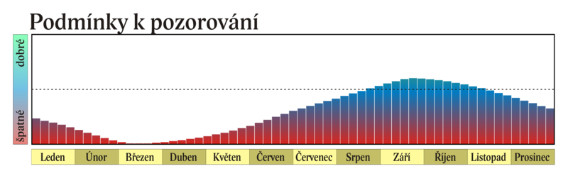 Dobře pozorovatelný je Saturn až do konce roku, kdy na konci občanského soumraku vrcholí 36° nad jižním obzorem, zapadá ve 23 hodin.