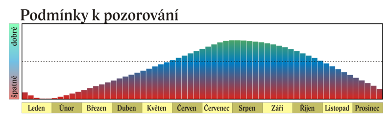 Trpasličí planetu Pluto lze spatřit většími amatérskými astronomickými dalekohledy, případně zachytit fotograficky. Po celý rok 2025 se zdržuje 1 až 2 stupně jižně a jihozápadně od hvězdy 4 Cap (+5,85 mag). Stále má velmi nízkou deklinaci, která se pohybuje v rozmezí od -23° 6,9´ na začátku roku do -22° 42,5´ v dubnu zpět k letošnímu minimu -23° 32,3´ v říjnu.